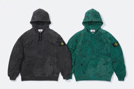 シュプリームスパイダーをあしらったスウェットやクルーネックTシャツは、シュプリームらしい遊び心とストーンアイランドのクラフトマンシップが見事に融合した分類名と言える。バイカラーのロングスリーブトップスも、色彩に対する両ブランドの敏感なアンテナを感じさせる。